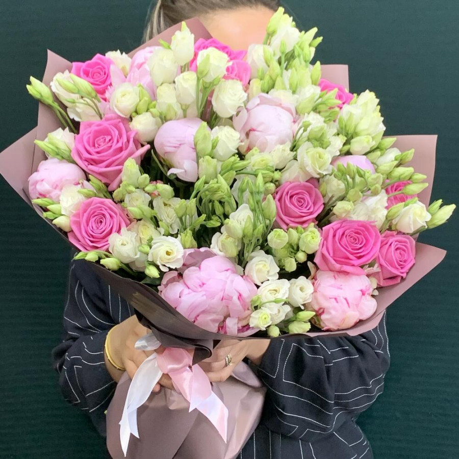На фото букет «дыхание любви». В составе: роза 10 шт, эустома (лизиантус) 13 шт, пион 7 шт, дизайнерская упаковка 2 шт, атласная лента 1 шт, . Все цветы свежие и ароматные, букет красиво оформлен и отлично подходит для подарка. Доступна доставка цветов или самовывоз.