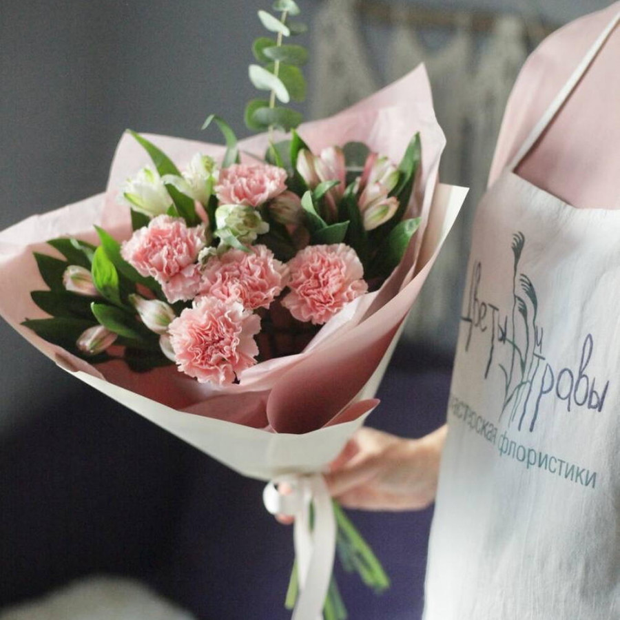 На фото букет «пудровая вуаль». В составе: альстромерия 3 шт, гвоздика 5 шт, эвкалипт 2 шт, дизайнерская упаковка 1 шт, атласная лента 1 шт, . Все цветы свежие и ароматные, букет красиво оформлен и отлично подходит для подарка. Доступна доставка цветов или самовывоз.